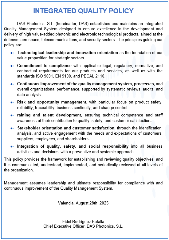 DAS Photonics is a Spanish company providing high-end solutions based on its proprietary photonics technology for the most demanding applications worldwide both in Space Communications and in Signal Intelligence fields.